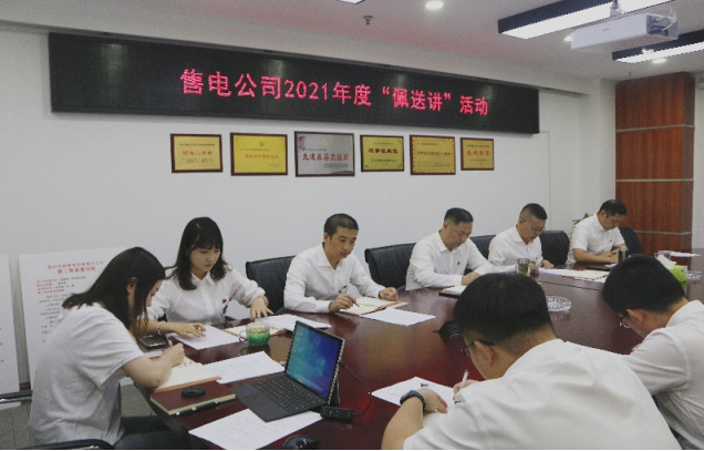 8月27日上午,售电公司2021年“佩送讲”活动、“我为群众办实事”调研座谈会在会议室召开,会议由党支部书记、董事、总经理杜刚主持,支委委员、常务副总经理李树国及全体党员干部职工参加。